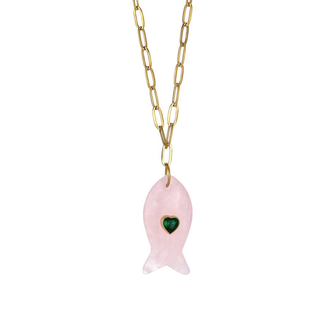 Esta elegante cadena con dije en forma de pez ofrece la opción de elegir entre seis variedades de piedras naturales: ojo de tigre, ónix, cuarzo rosado, topacio, lapislázuli y calcedonia. Cada piedra aporta sus propiedades únicas, desde la protección y energía del ojo de tigre hasta la calma y armonía del cuarzo rosado. Perfecta para quienes buscan un accesorio personalizado que combine estilo y significado en una joya cuidadosamente elaborada.